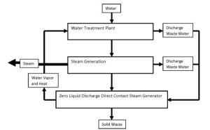 The discharge waste water from the steam generation blow down or from the OTSG, after flashing the generated water, is directed to the DCSG, together with any other liquid waste discharged streams. The DCSG evaporates the water by direct mixture with combustion gas stream while using the combustion heat energy to transfer the water into gas. The solids are removed in a stable form. The water and heat are recovered from the discharged gas flow. The water is recycled and used as BFW and the heat is used to operate the distillation unit.