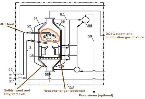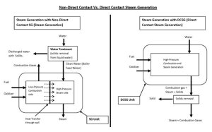 In “Direct Contact Steam Generation” (DCSG), the heat is transferred between the combustion gases and the liquid water through the direct mixing of the two flows. The combustion pressure is similar to the produced steam pressure and the combustion gases are mixed with the steam. The DCSG can also be referred to as direct contact evaporator or direct contact dryer. Depending on the system used, Low Pressure (LP), Medium Pressure (MP), or High Pressure (HP), stream can be produced.