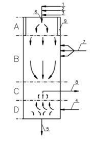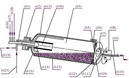 The figure below represents a DCSG with down-flow combustor integrated with internal heat exchanger and water injection for direct contact steam generation and solid discharge at the bottom.